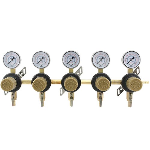 You don’t need five separate air regulators to dispense beer in your multi-keg setup. Instead just invest in the dependable efficiency of this five-gauge secondary CO2 regulator! Each of the five gauges of this secondary gas regulator is capable of flawless pressure regulation of one individual keg in your draft dispensing system. This makes it easy to ensure that all of your kegs are properly calibrated without attaching a separate primary regulator to each barrel of beer. For total control, you can even utilize the shut off valve on each gauge and cut the pressure off completely if needed. The polycarbonate bonnet of this secondary regulator is much stronger and more lightweight than a traditional zinc bonnet and it also better stands up to the corrosive possibilities of operation in a wet environment. And for ultimate convenience, the adjustment of each gauge is completely tool-free. Just pull the cap knob, twist to the desired pressure, push it back into place, and enjoy the hassle-free dispensing! If you want to save time, money, and energy with regards to setting up your multi-keg draft dispensing system, you need this 5-Way Secondary Air Regulator with Polycarbonate Bonnet! In stock and ready to ship. Features: Bonnet material is glass-filled polycarbonate. 0-60 PSI keg pressure gauge. 0-2000 PSI tank pressure gauge. Air shut off switch for each CO2 line. High CO2 volumetric flow to insure continuity in product dispensing. 10 Micron filter built in to keep contaminants out of regulator. Less prone to freeze up problems. Gray bonnet. Approved by Pepsi and Coca-Cola. Specs: Dimensions: 18 1/2″L x 6 1/2″H x 3 1/4″D.Bonnet material is glass-filled polycarbonate.