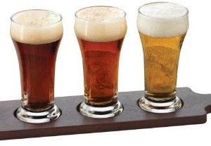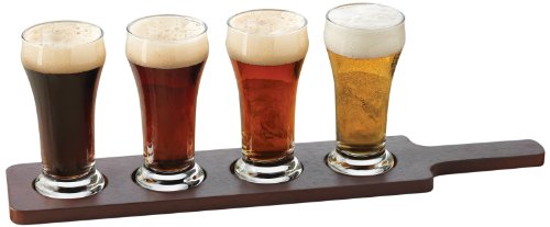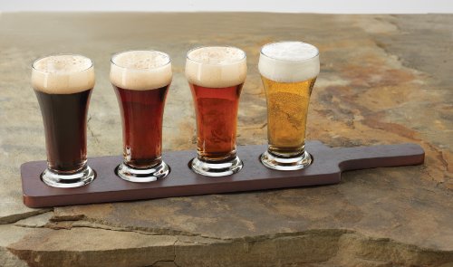 This Craft Brews beer flight set is excellent for sampling small quantities of a variety of different brews. It’s great for parties or times when you only want a small glass of beer. The complete set contains four 6 ounce pilsner glasses, measuring 5” tall and 2-5/8” in diameter and one wood carrier, measuring 3.6” by 17”. It’s a great bachelor, housewarming, or host gift, as well as an excellent addition for the beer lovers collection. It is part of the Libbey Craft Brews collection. Glasses are dishwasher safe and made in the USA. Wood carrier is made in China and hand-washing is recommended.