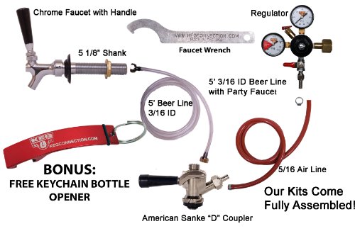 Refrigerator Conversion Kit, 1 Sanke tap for one Standard American Keg (Sanke tap is used on 95% of beers sold in the US). Fully Assembled! Very simple to set up, the hoses and pieces are already assembled!!! The Kit Includes: 2 gauge CO2 Regulator (built using American Made Body with high quality components!) with checkvalve shutoff, Sanke Tap, Shank for Refrigerator with line attached, metal faucet that screws directly into Shank, faucet handles and stainless worm clamps. Kit comes fully assembled!
